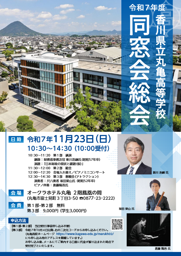 令和7年11月23日(日)に、故郷は香川県のオークラホテル丸亀において「令和7年度 丸亀高校 同窓会総会」が行われます。東京丸高会においても宣伝させて頂いていますので、ご都合つく方は是非ともご参加ください。